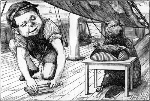 | Navigation was always a difficult art, Though with only one ship and one bell: And he feared he must really decline, for his part, Undertaking another as well. The Beaver’s best course was, no doubt, to procure A second-hand dagger-proof coat— So the Baker advised it—and next, to insure Its life in some Office of note: This the Banker suggested, and offered for hire (On moderate terms), or for sale, Two excellent Policies, one Against Fire, And one Against Damage From Hail. Yet still, ever after that sorrowful day, Whenever the Butcher was by, The Beaver kept looking the opposite way, And appeared unaccountably shy. |
