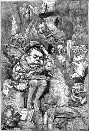 | “It’s not in Nursery Rhymes? And yet I almost think it is— ‘Three little Ghosteses’ were set ‘On posteses,’ you know, and ate Their ‘buttered toasteses.’ “I have the book; so, if you doubt it—” I turned to search the shelf. “Don’t stir!” he cried. “We’ll do without it; I now remember all about it; I wrote the thing myself. “It came out in a ‘Monthly,’ or At least my agent said it did: Some literary swell, who saw It, thought it seemed adapted for The Magazine he edited. “My father was a Brownie, Sir; My mother was a Fairy. [Pg 28]The notion had occurred to her, The children would be happier, If they were taught to vary. “The notion soon became a craze; And, when it once began, she Brought us all out in different ways— One was a Pixy, two were Fays, Another was a Banshee; “The Fetch and Kelpie went to school, And gave a lot of trouble; Next came a Poltergeist and Ghoul, And then two Trolls (which broke the rule), A Goblin, and a Double— “(If that’s a snuff-box on the shelf,” He added with a yawn, “I’ll take a pinch)—next came an Elf, And then a Phantom (that’s myself), And last, a Leprechaun. “One day, some Spectres chanced to call, Dressed in the usual white: [Pg 29]I stood and watched them in the hall, And couldn’t make them out at all, They seemed so strange a sight. |