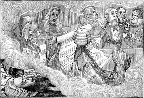 | The Witnesses proved, without error or flaw, That the sty was deserted when found: And the Judge kept explaining the state of the law In a soft under-current of sound. The indictment had never been clearly expressed, And it seemed that the Snark had begun, And had spoken three hours, before any one guessed What the pig was supposed to have done. The Jury had each formed a different view (Long before the indictment was read), And they all spoke at once, so that none of them knew One word that the others had said. “You must know—” said the Judge: but the Snark exclaimed “Fudge! That statute is obsolete quite! Let me tell you, my friends, the whole question depends On an ancient manorial right. “In the matter of Treason the pig would appear To have aided, but scarcely abetted: [Pg 170]While the charge of Insolvency fails, it is clear, If you grant the plea ‘never indebted.’ “The fact of Desertion I will not dispute: But its guilt, as I trust, is removed (So far as relates to the costs of this suit) By the Alibi which has been proved. “My poor client’s fate now depends on your votes.” Here the speaker sat down in his place, And directed the Judge to refer to his notes And briefly to sum up the case. But the Judge said he never had summed up before; So the Snark undertook it instead, And summed it so well that it came to far more Than the Witnesses ever had said! When the verdict was called for, the Jury declined, As the word was so puzzling to spell; But they ventured to hope that the Snark wouldn’t mind Undertaking that duty as well. [Pg 171] So the Snark found the verdict, although, as it owned, It was spent with the toils of the day: When it said the word “GUILTY!” the Jury all groaned And some of them fainted away. Then the Snark pronounced sentence, the Judge being quite Too nervous to utter a word: When it rose to its feet, there was silence like night, And the fall of a pin might be heard. “Transportation for life” was the sentence it gave, “And then to be fined forty pound.” The Jury all cheered, though the Judge said he feared That the phrase was not legally sound. But their wild exultation was suddenly checked When the jailer informed them, with tears, Such a sentence would have not the slightest effect, As the pig had been dead for some years. The Judge left the Court, looking deeply disgusted: But the Snark, though a little aghast, [Pg 172]As the lawyer to whom the defence was intrusted, Went bellowing on to the last. Thus the Barrister dreamed, while the bellowing seemed To grow every moment more clear: Till he woke to the knell of a furious bell, Which the Bellman rang close at his ear. |