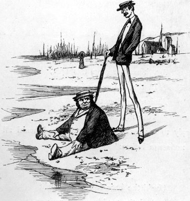 | The girls (just like them!) all agree To praise J. Jones, Esquire: I ask them what on earth they see About him to admire? They cry “He is so sleek and slim, It’s quite a treat to look at him!” They vanish in tobacco smoke, Those visionary maids— I feel a sharp and sudden poke Between the shoulder-blades— “Why, Brown, my boy! You’re growing stout!” (I told you he would find me out!) “My growth is not your business, Sir!” “No more it is, my boy! But if it’s yours, as I infer, Why, Brown, I give you joy! A man, whose business prospers so, Is just the sort of man to know! “It’s hardly safe, though, talking here— I’d best get out of reach: For such a weight as yours, I fear, Must shortly sink the beach!”— [Pg 185] Insult me thus because I’m stout! I vow I’ll go and call him out! |