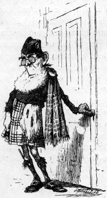 | Out spake the boy in buttons (I ween he wasna thin), “Now wha will tae the parlour gae, And stay this deadlie din?” And they have taen a kerchief, Casted their kevils in, For wha should tae the parlour gae, And stay that deadlie din. When on that boy the kevil fell To stay the fearsome noise, “Gae in,” they cried, “whate’er betide, Thou prince of button-boys!” Syne, he has taen a supple cane To swinge that dog sae fat: The doggie yowled, the doggie howled The louder aye for that. Syne, he has taen a mutton-bane— The doggie ceased his noise, And followed doon the kitchen stair That prince of button-boys! |