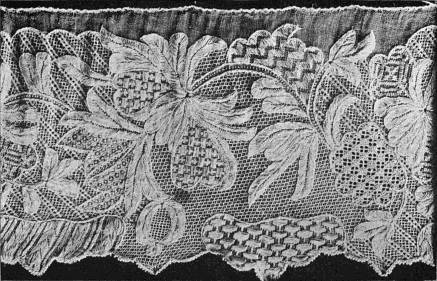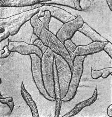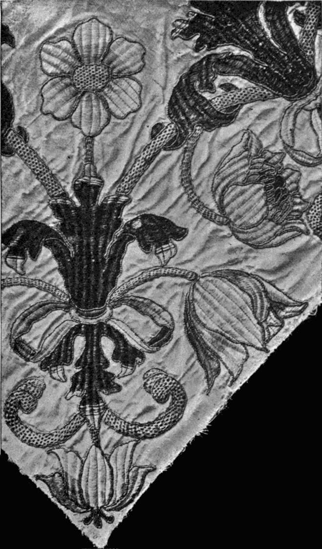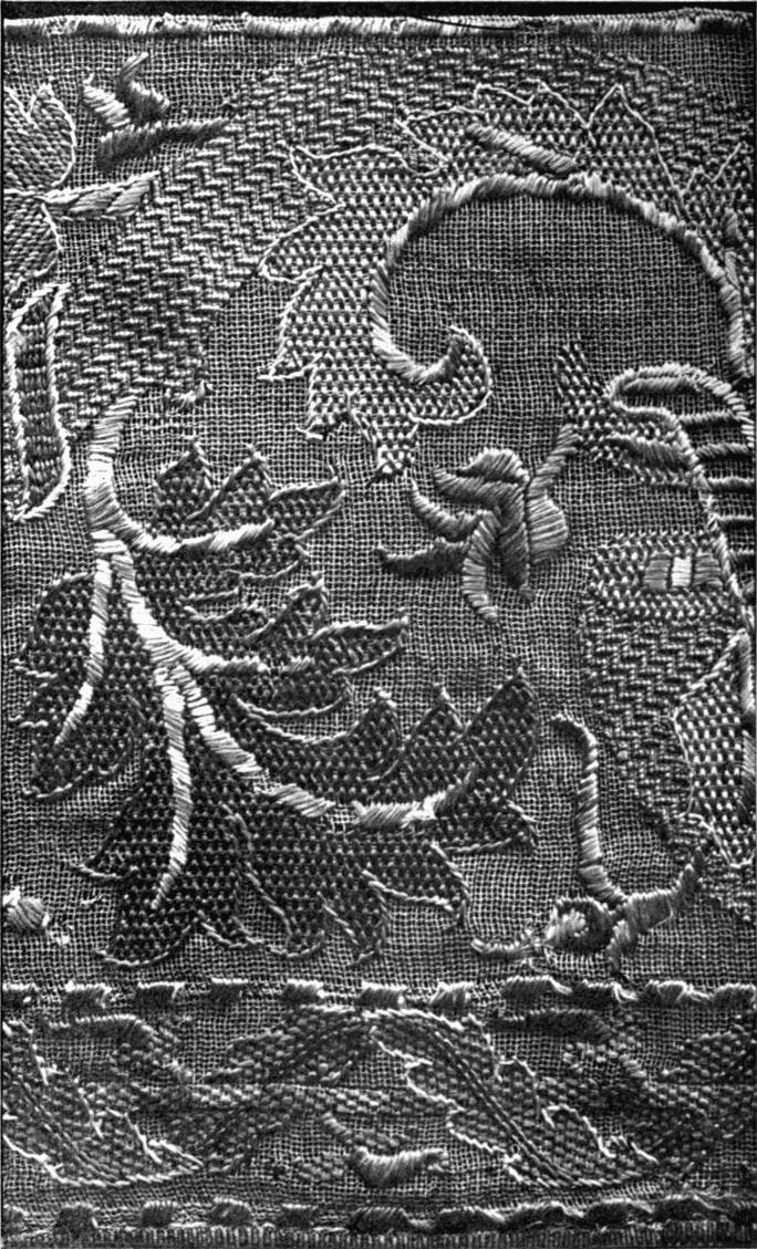 - DARNING AND SATIN-STITCH on square mesh—The darning leaf, green, follows the lines of the stuff; outlined with yellow, veined with pink and white; stem, yellow, its foliation pink, outlined with white, and ribbed with blue and white. Italian. 17th century. (V. & A. M.)