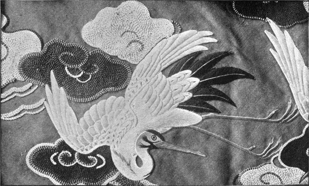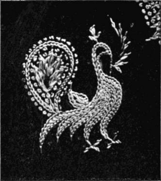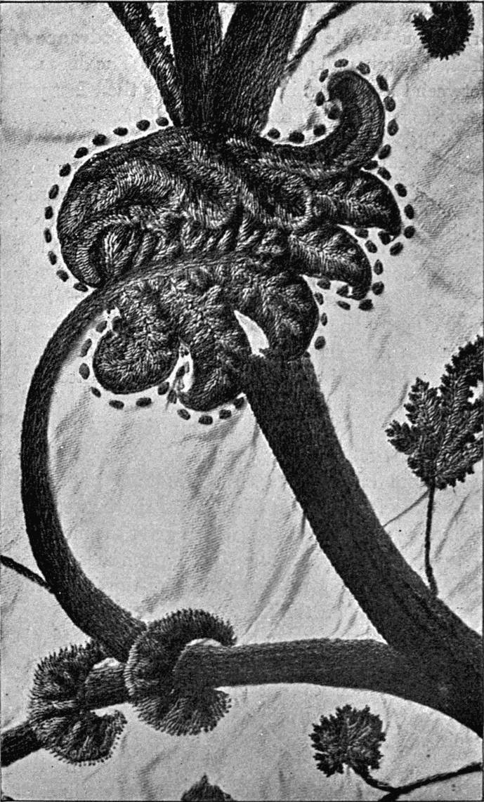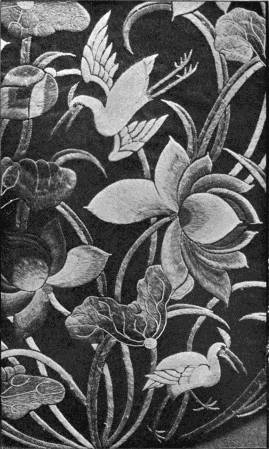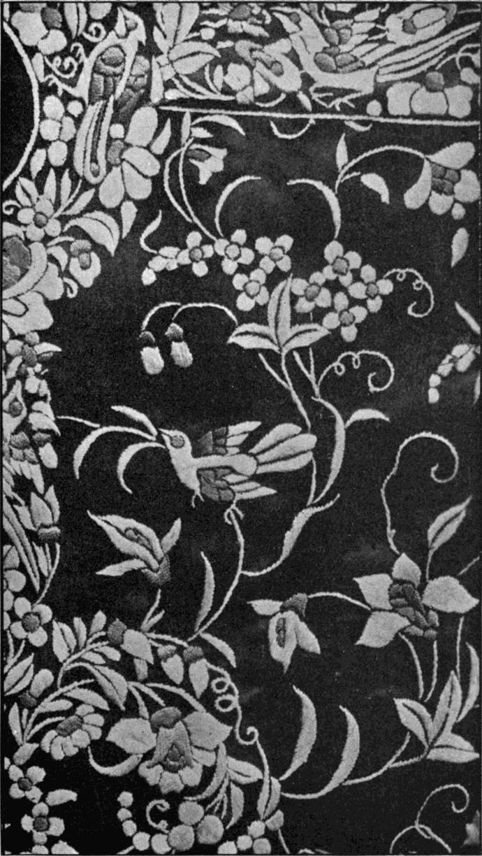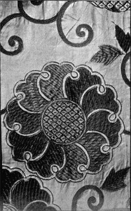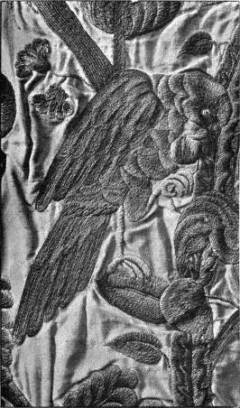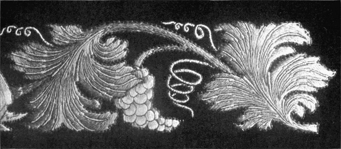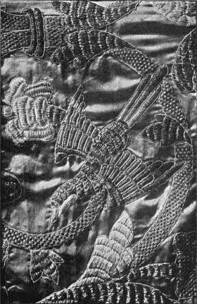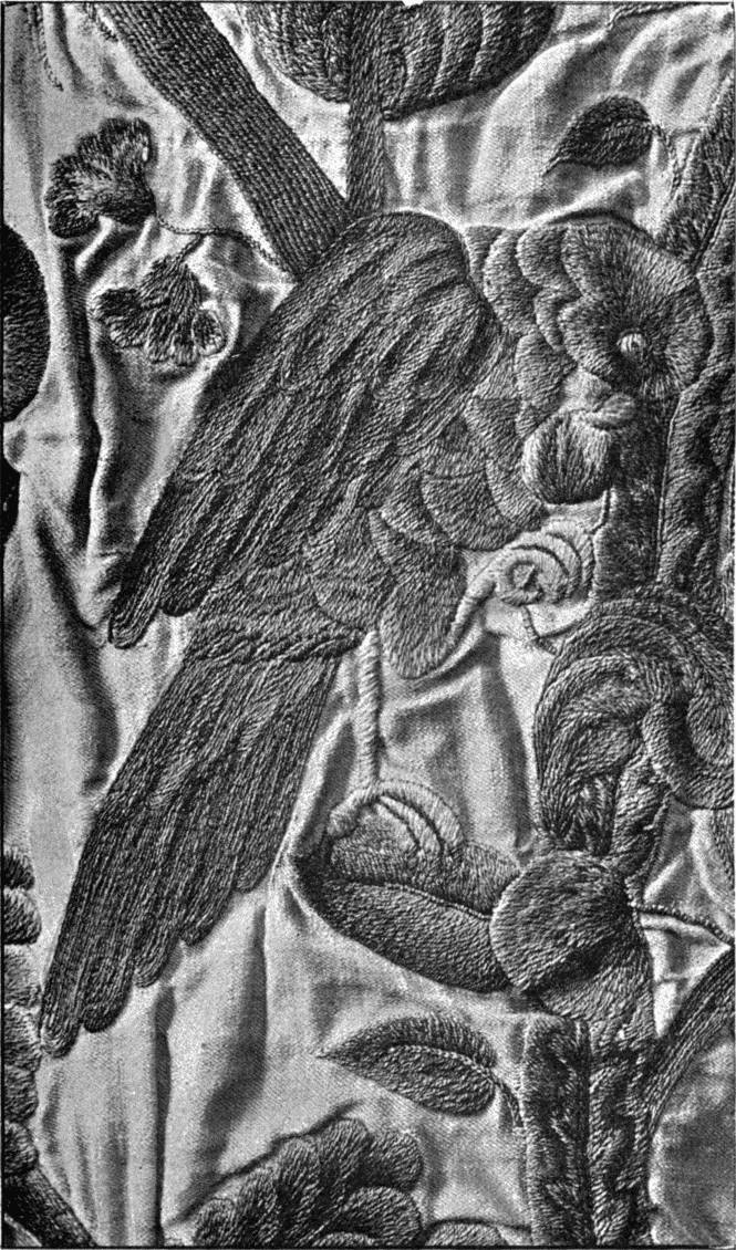 - SATIN-STITCH AND, on the birds' bodies, PLUMAGE-STITCH—The ends of the stalks worked in French knots; the veins of the leaves in fine white cords laid on to the satin stitch. The outlines voided, and the voiding occasionally worked across with stitches wide enough apart to show the ground between. In white and bright-coloured silk floss upon a black satin ground. Chinese. (Mrs. L. F. D.)