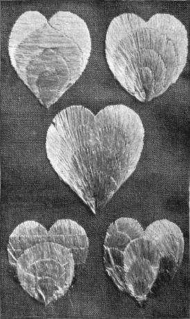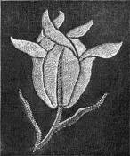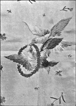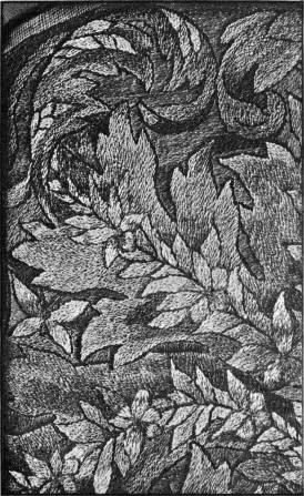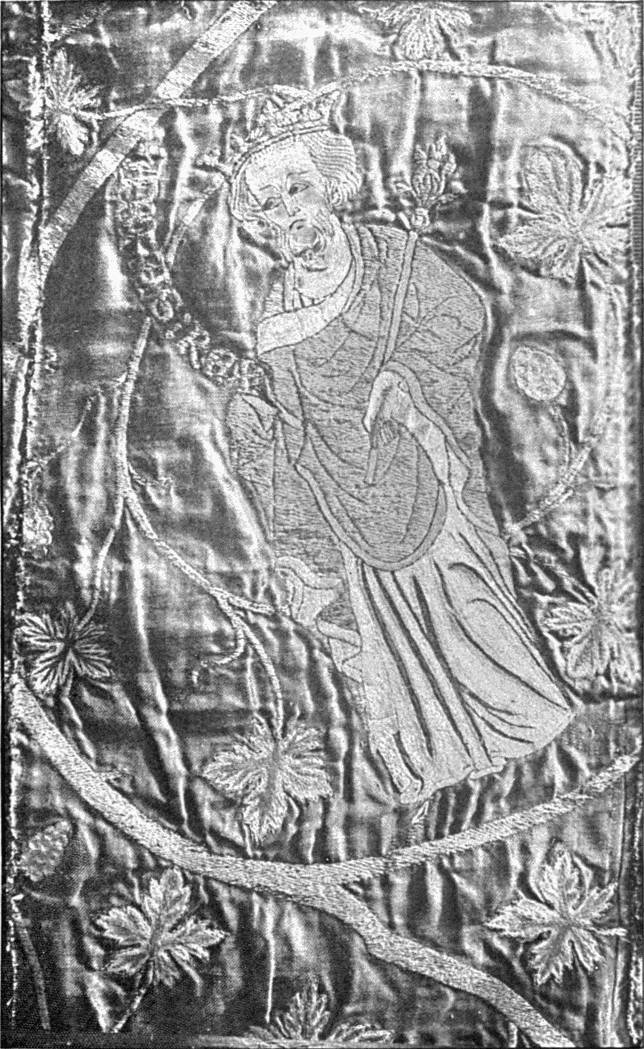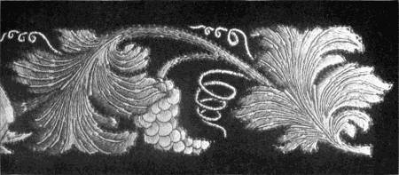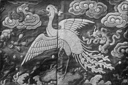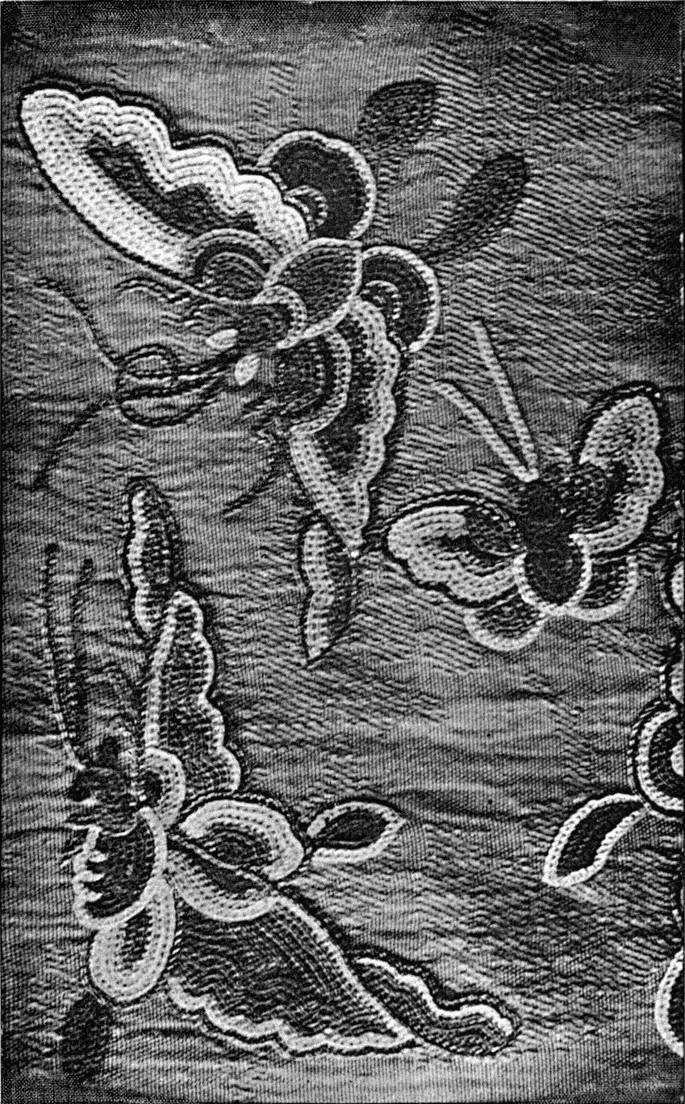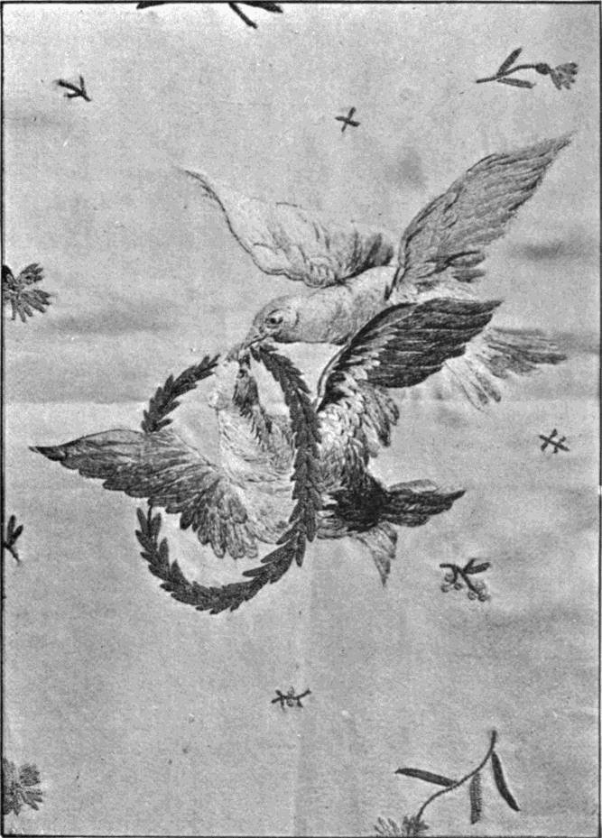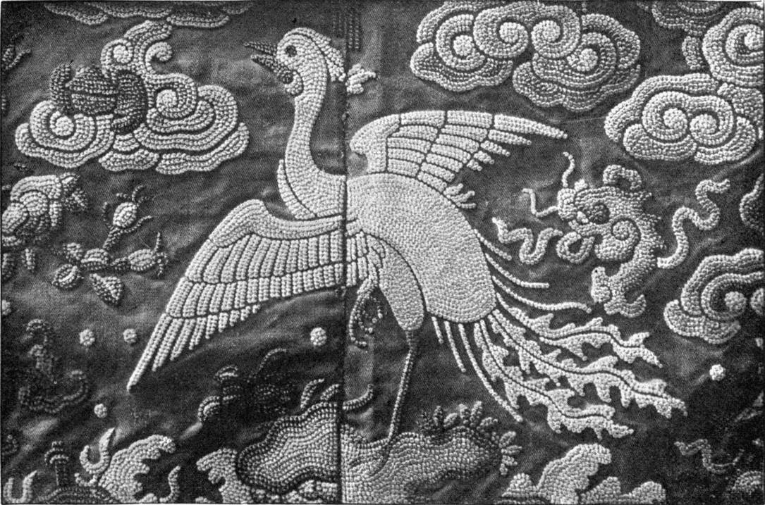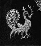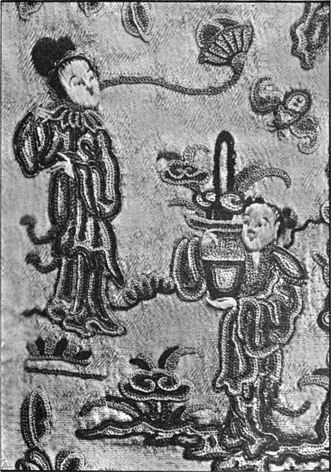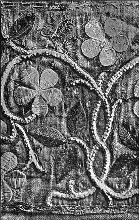 - SATIN-STITCH AND, on the birds' bodies, PLUMAGE-STITCH—The ends of the stalks worked in French knots; the veins of the leaves in fine white cords laid on to the satin stitch. The outlines voided, and the voiding occasionally worked across with stitches wide enough apart to show the ground between. In white and bright-coloured silk floss upon a black satin ground. Chinese. (Mrs. L. F. D.)