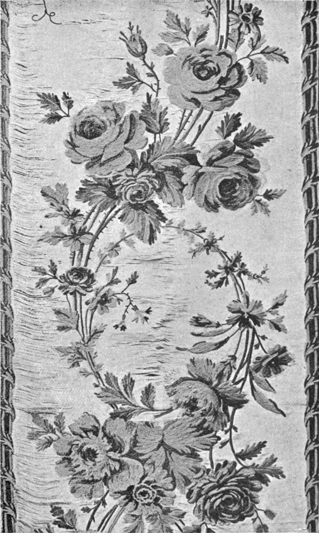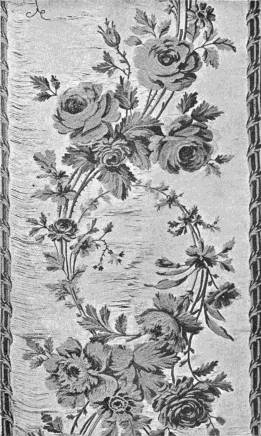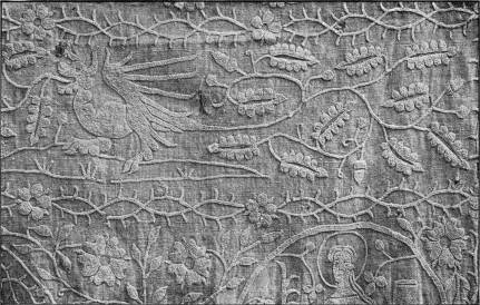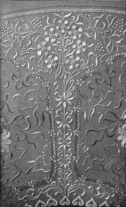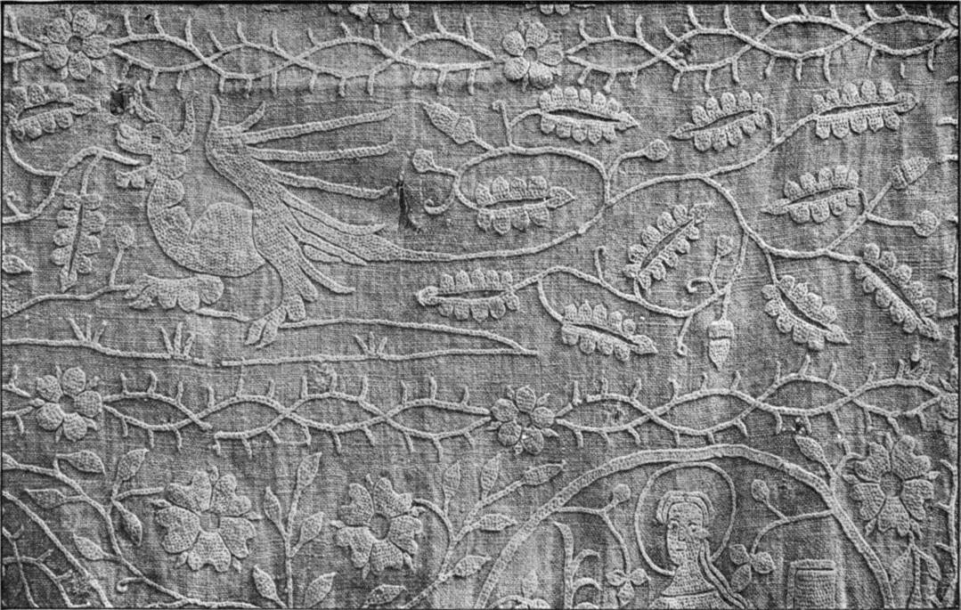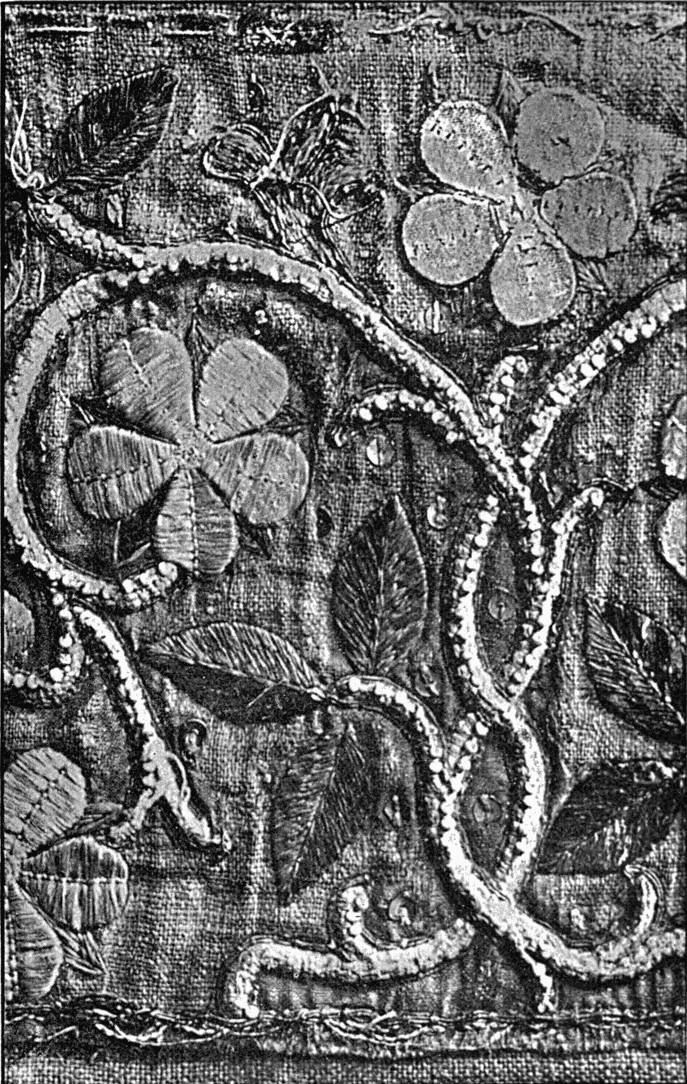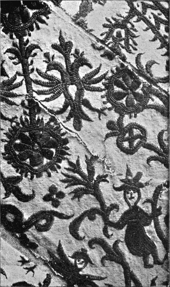 - CREWEL-WORK, in which crewel-stitch hardly occurs. Embroidered in coloured wools upon white cotton. Old English. (Coll. of J. M. Knapp, Esq.)