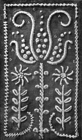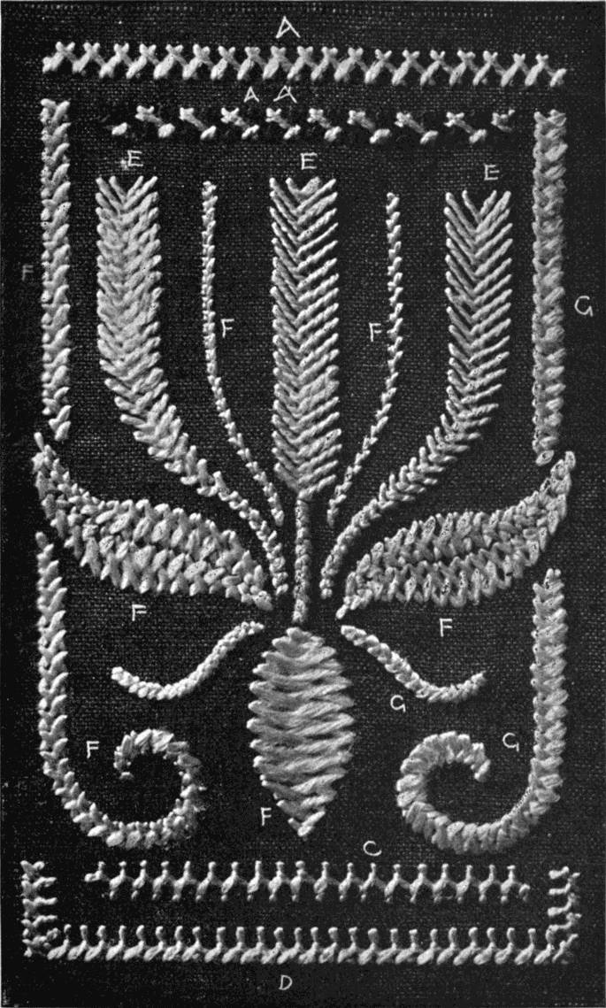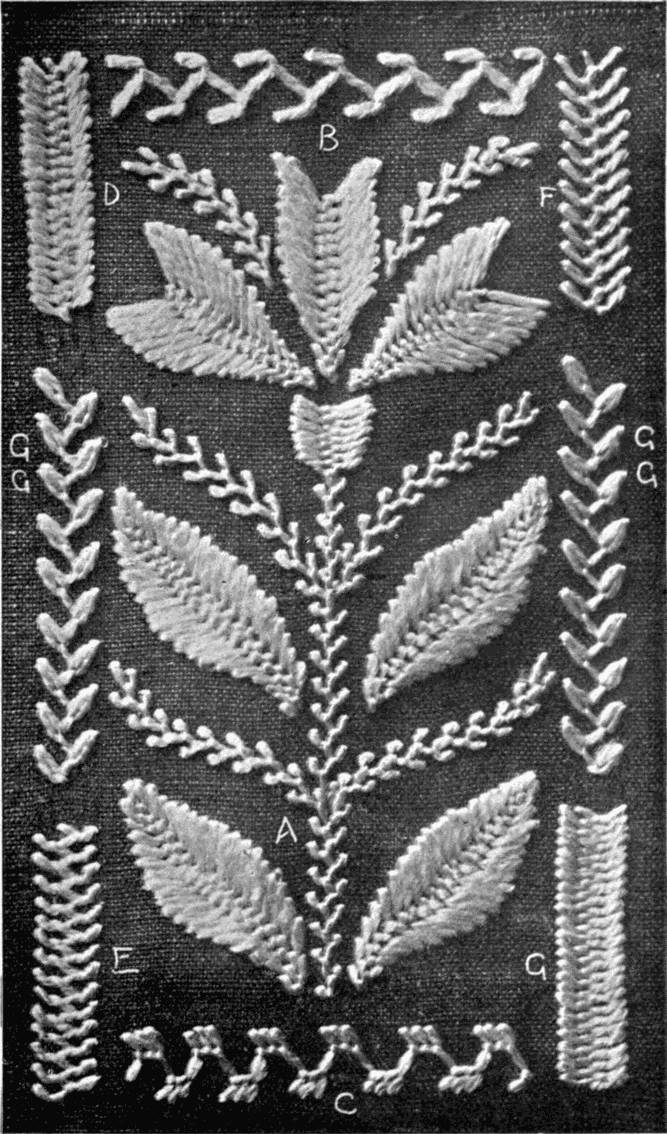- FEATHER-STITCH SAMPLER—A to G, ordinary feather-stitch and its variations; G G, feather chain.