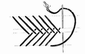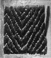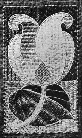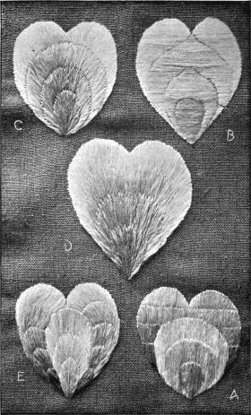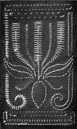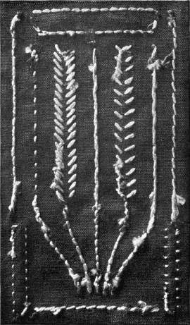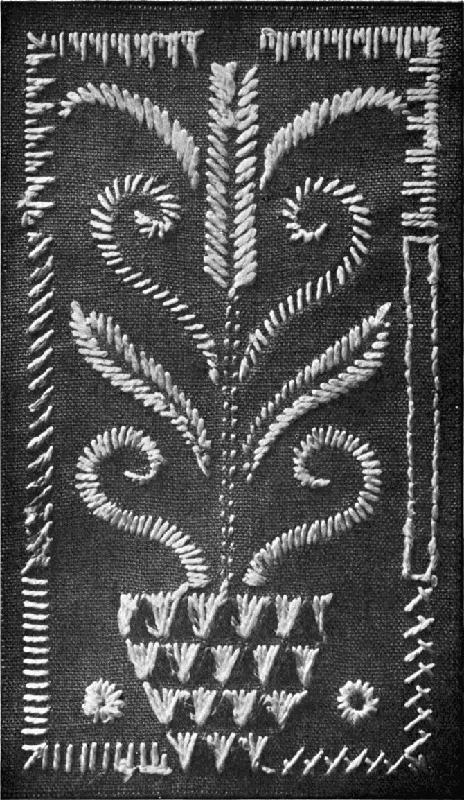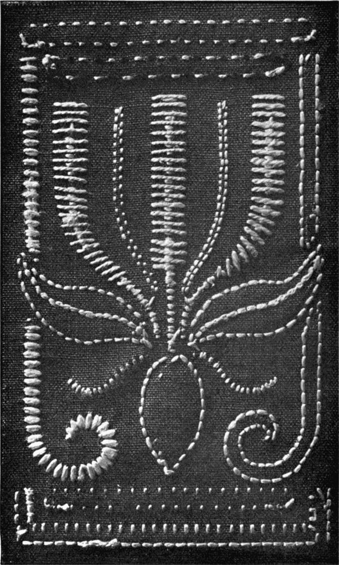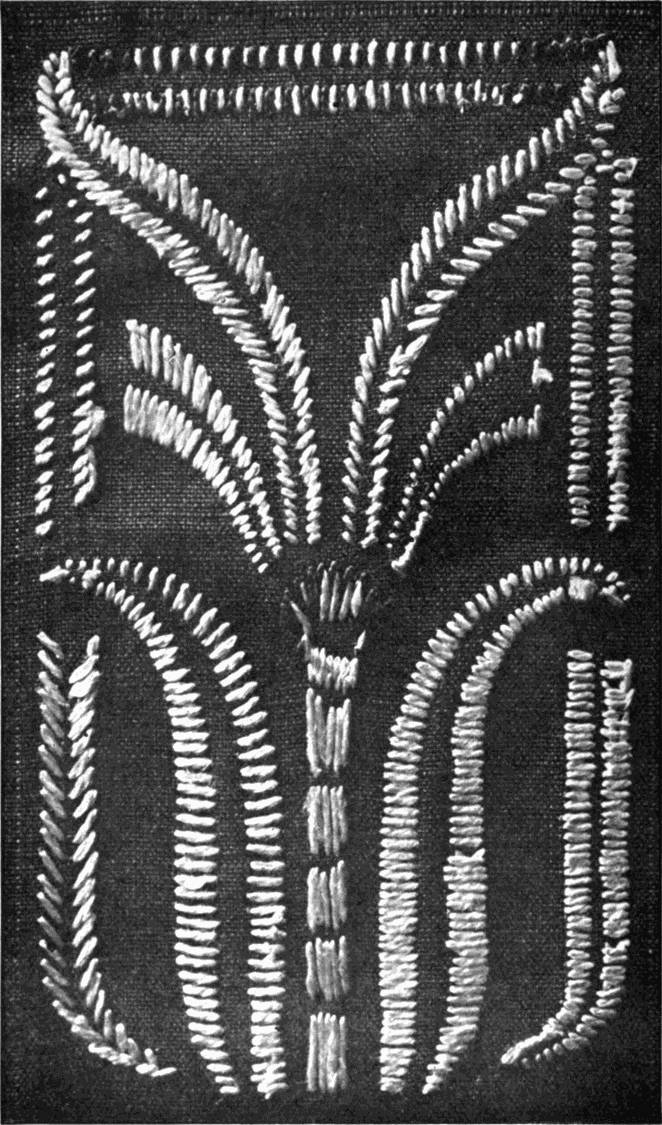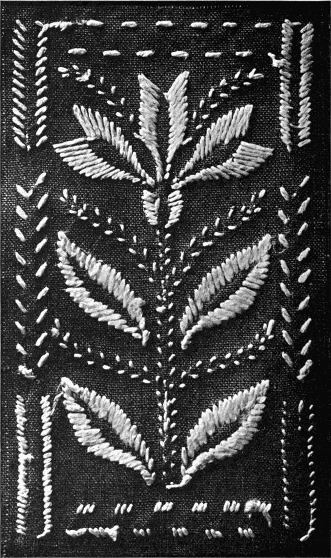 - SATIN-STITCH SAMPLER—Worked in floss, the stitch in various directions, to give different effects. Incidentally it shows various ways of breaking up a surface in satin-stitch. Compare with Illustration 38, which shows the effect of the stitch in twisted silk.