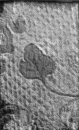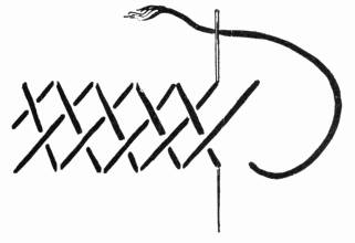 - CUSHION AND SATIN-STITCHES UPON CANVAS—The Satin-stitches follow the lines of the stuff, and form a diaper built upon them. Compare Illustration 71.