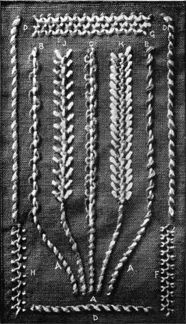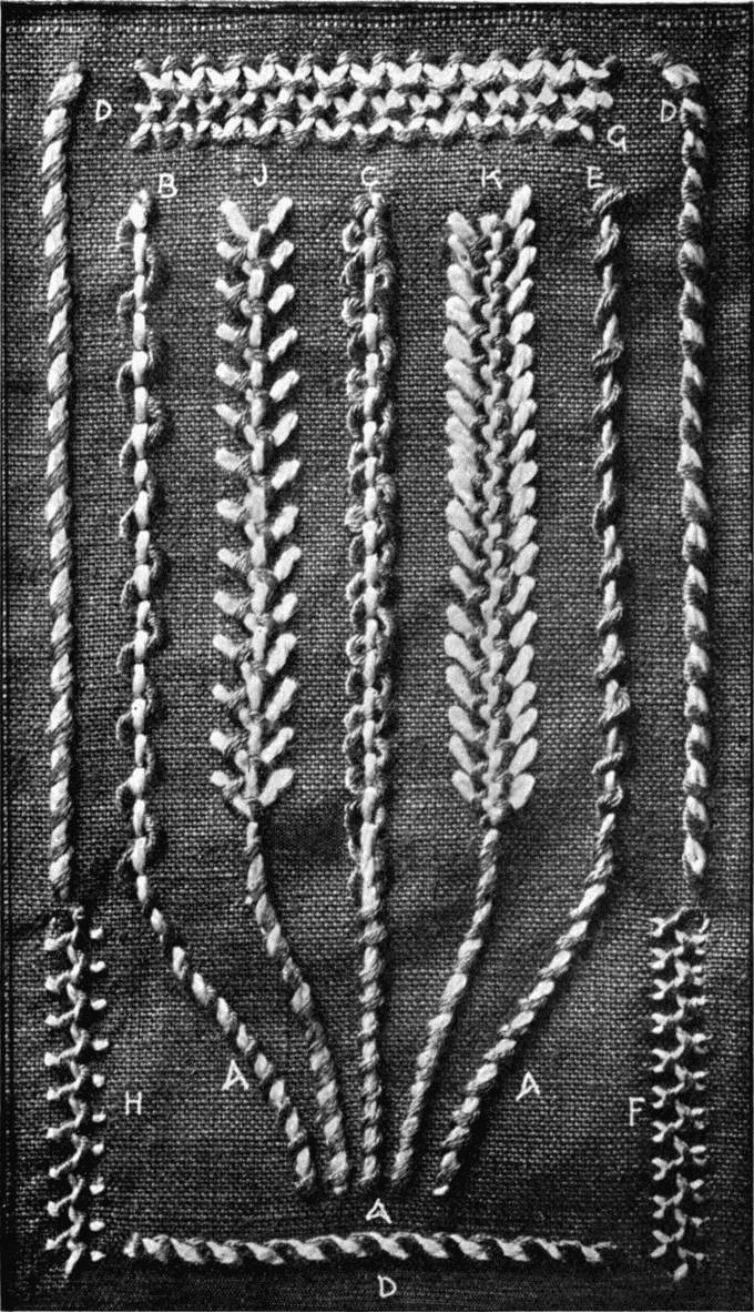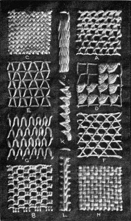- INTERLACING-STITCH SAMPLER—A, Interlaced crewel-stitch; B, interlaced back-stitch; C, back-stitch twice interlaced; D, interlaced chain-stitch; E, interlaced darning; F, interlaced herringbone; G, herringbone twice interlaced; H, an interlaced version of C in Illustration 20; J, interlaced Oriental-stitch; K, interlaced feather-stitch.