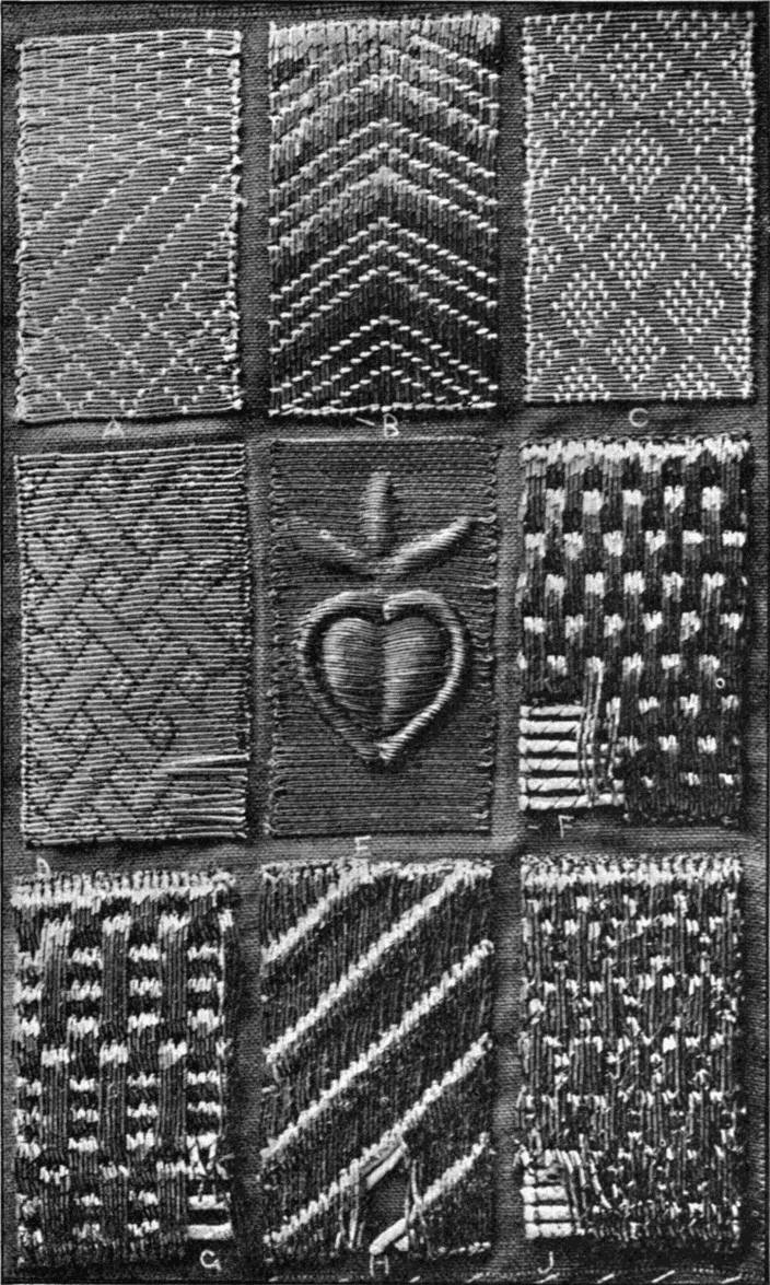 - SURFACE-STITCH SAMPLER—A, D, G, various surface stitches; B, surface buttonhole; H and C, surface darning; E, Japanese darning, as it is called; F, net passing; J, surface buttonhole over bars; K, surface buttonhole over slanting stitches.