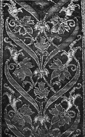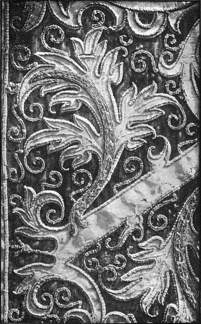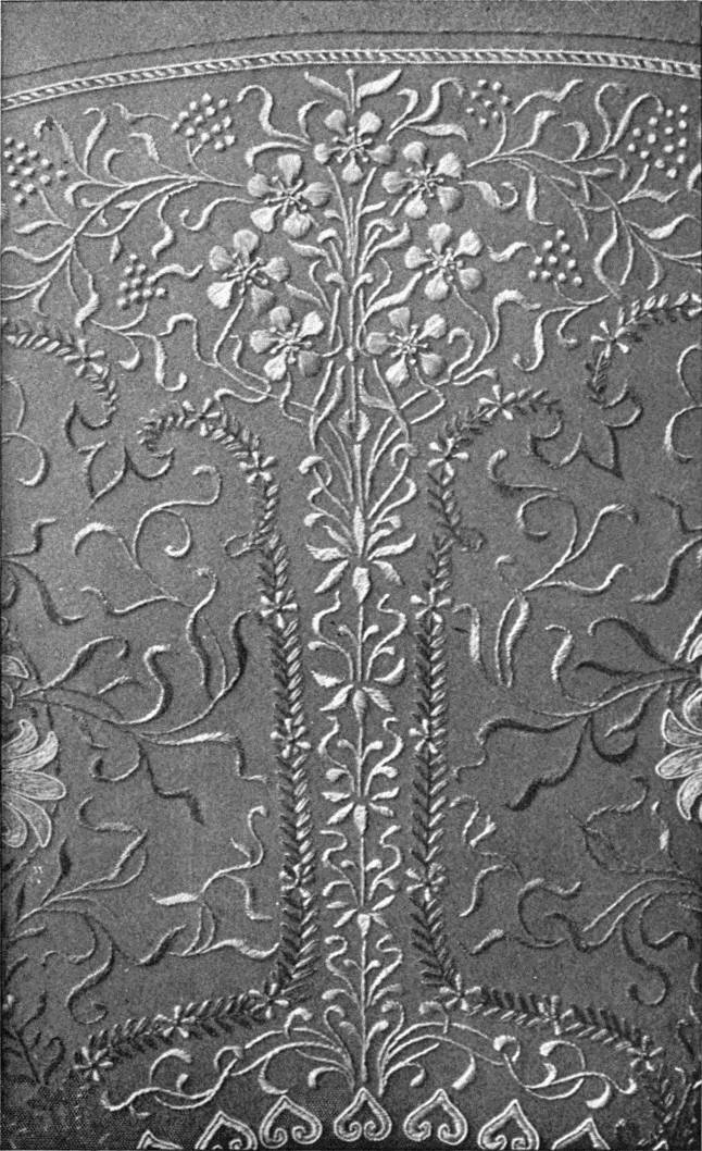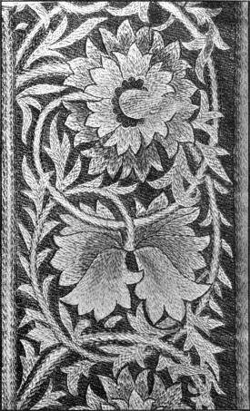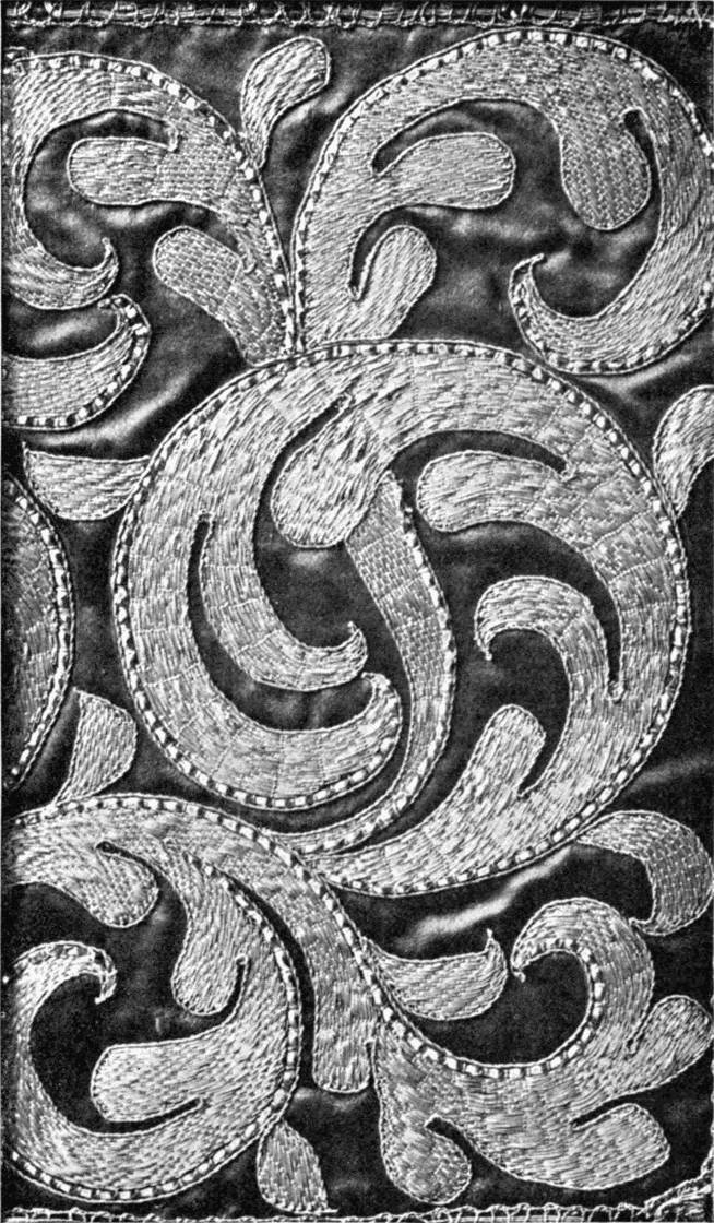 - SATIN-STITCH IN TWISTED SILK—Outlines voided. Worked in white and occasional red and yellow upon black satin. Indian. Modern. (V. & A. M.)[xv]