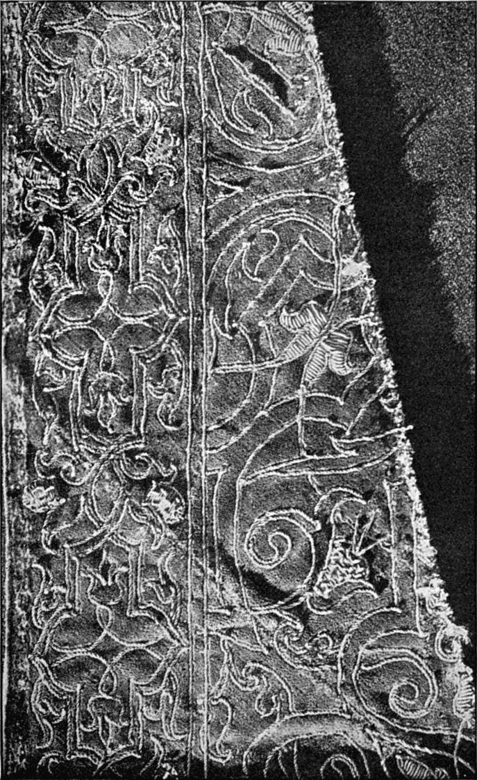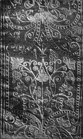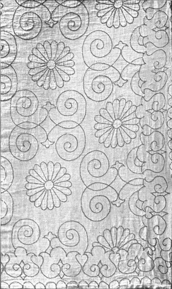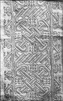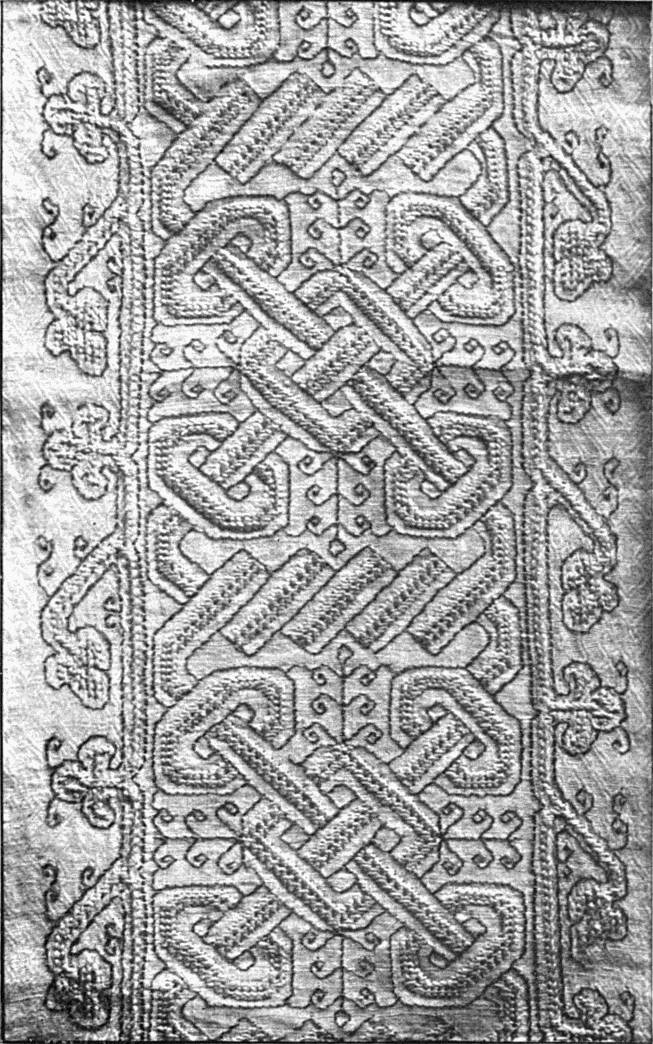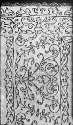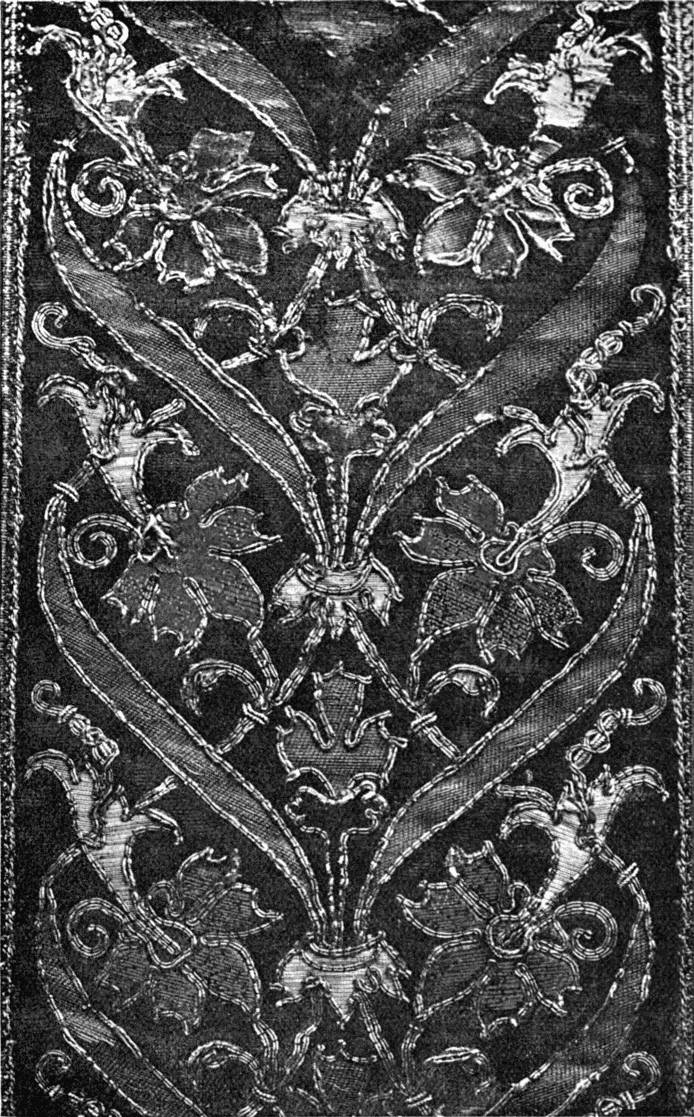 - CHAIN AND SURFACE STITCHES—the latter a kind of buttonholing, only occasionally worked into the stuff. Part of a lectern cover in white thread upon a thin, greyish white linen stuff. German, 14th century. (V. & A. M.)