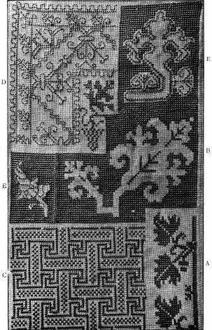 - CANVAS-STITCH SAMPLER—A, tent-stitch; B, half-cross-stitch; C, cushion-stitch; D, Moorish-stitch, so called; E, plait-stitch; F, couching on canvas.[xii]