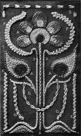 - CHAIN-STITCH SAMPLER—A, chain-stitch solid and in line; B, magic stitch; C, church chain; D, cable chain; E, Vandyke chain; F, Mountmellic chain; G, Mountmellic cable—all so called.