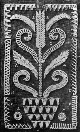 - CREWEL-STITCH SAMPLER—A and C, crewel-stitch; B and D, outline-stitch; E, back-stitch; F, spots; G and H, stem-stitch; J, crewel and outline-stitches in combination.