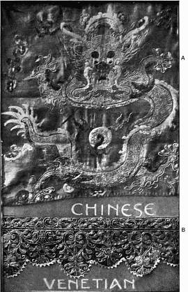 - DRAWN-WORK ON FINE LINEN, embroidered with gold and colour. Oriental. (From the collection of Mrs. Lewis F. Day.)