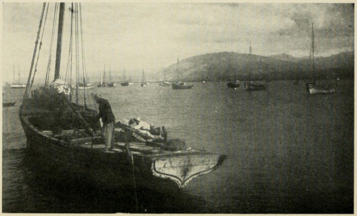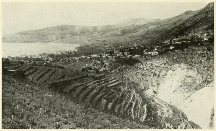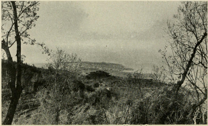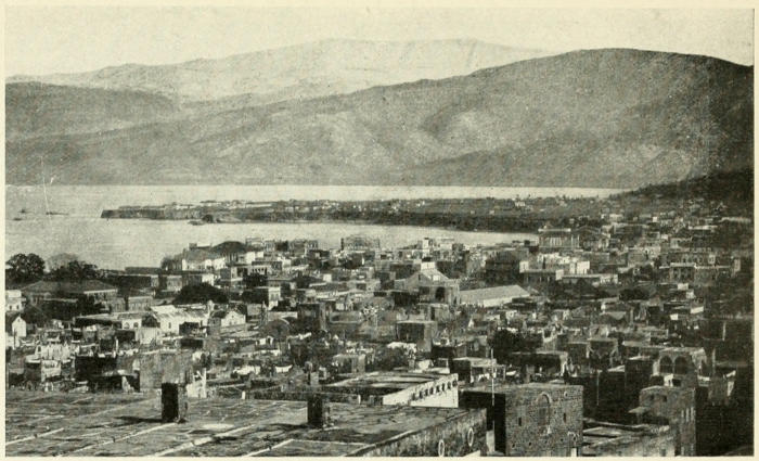 We watched floods of red and orange sweep across the lofty summits and then brighten into crowns of mellow gold. We looked into gorges tinged with a purple so rich and deep that the color itself seemed almost a tangible thing. Nearer still we drew, and at the foot of the mountains there came into view dark forests of evergreen and broad, sloping orchards set here and there with tiny villages of shining white. Then there appeared long lines of silvery surf and yellow sand; and we skirted the northern edge of a rock-bound promontory to the crowded harbor of Beirut.