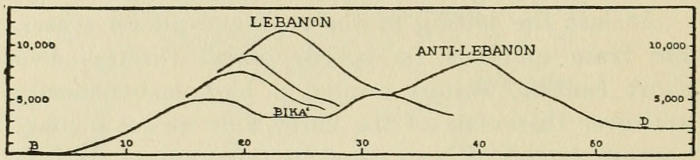 The wording of the Old Testament might lead one to infer that Lebanon is a single mountain, and the modern Syrians also familiarly refer to it as ej-Jebel—“The Mountain.” It is not, however, an isolated peak, but an entire range, which begins at the northern border of Palestine and stretches for a hundred miles along the easternmost shore of the Mediterranean. The narrow coastal plain cannot be distinguished at a distance. Straight out of the water the thousand summits rise in ever loftier ranks[3] up to the level profile of the central ridge, two miles above the sea.