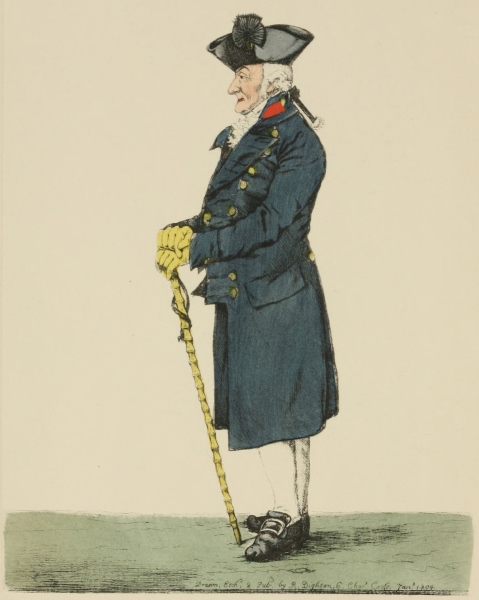 It is, however, not as a soldier, a pamphleteer, or a seer that Hanger has come down to posterity; and while some may recall that in 1772 he distinguished himself by being one of the gentlemen who, with drawn swords, forced a passage for the entry of Mrs Baddeley into the Pantheon, and eight and thirty years later rode on his grey palfrey in the procession formed in honour of the release of Sir Francis Burdett, it is for his eccentricities and his humour that he is remembered. Nollekens has related how one day he overheard Lord Coleraine inquire of the old apple-woman at the corner of Portland Road, evidently an old acquaintance, who was packing up her fruit, “What are you about, mother?” “Why, my Lord, I am going home to tea.” “Oh! don’t baulk trade. Leave your things on the table as they are; I will mind shop till you return”; and the peer seated himself in the old woman’s wooden chair, and waited until the meal was over, when he solemnly handed her his takings, threepence halfpenny.