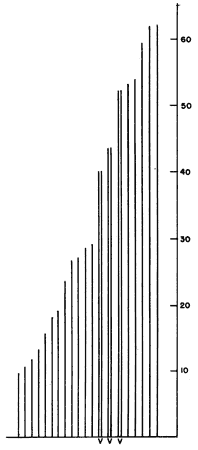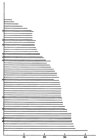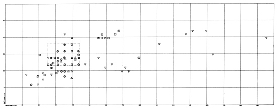 Complete dimensions can be taken on eighteen Chincha specimens in lots 4- and 16-. As figures 1 and 2 show, these dimensions cluster around two sets of proportions: the eleven cloths represented in the diagram in figure 1 are squarish; the seven in figure 2, with a length-to-width proportion of approximately two-to-three to one, are rectangular. Four of the squarish cloths are formed of two separately woven breadths of material. All the rectangular cloths are single breadths.