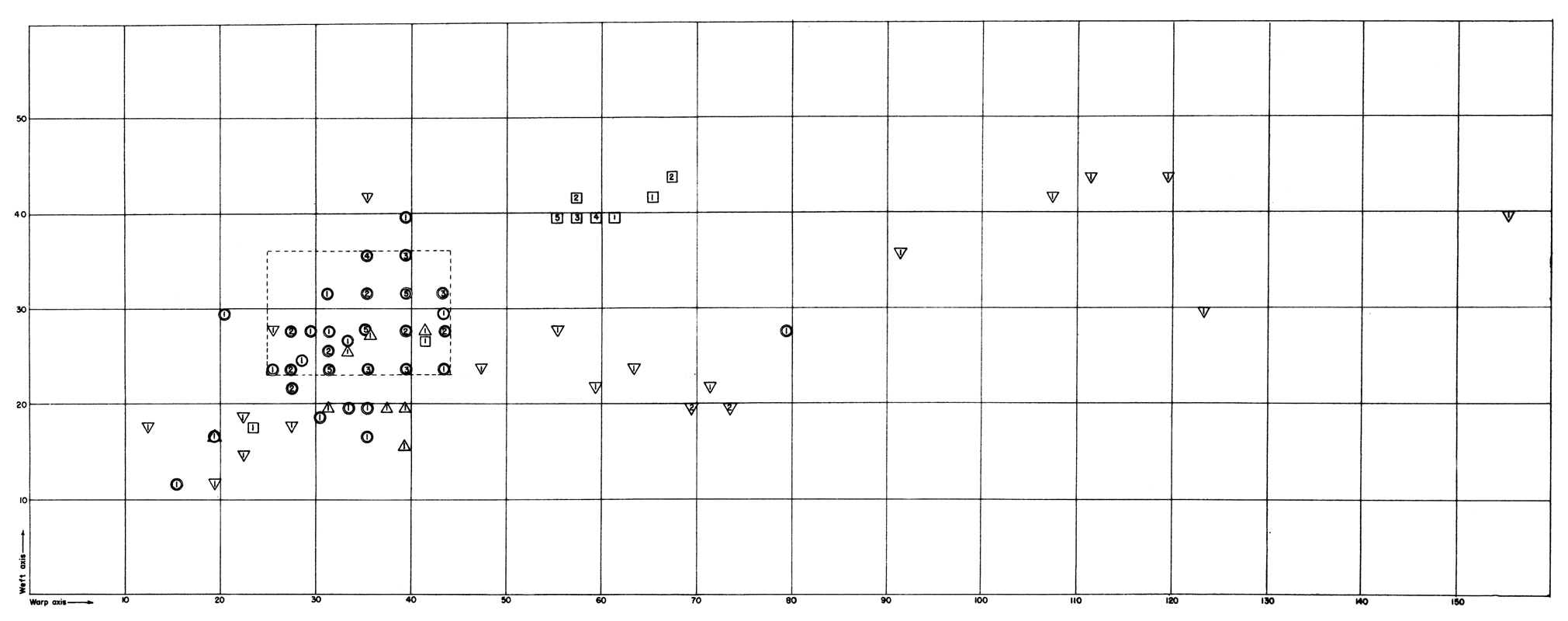 In terms of weaving units, whether single yarns or pairs of yarns, 56 of the 112 counts taken fall within a range of 26 to 44 warp units and 24 to 36 weft units. Figure 5 shows this concentration within the frame.