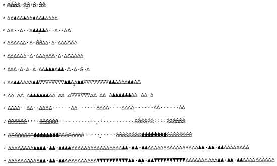 Fig. 7. Schematic representations of stripings with color changes indicated by symbols. Units consisting of pairs of warps represented by pairs of triangles. Chevron marks center of bilateral groupings of colors.