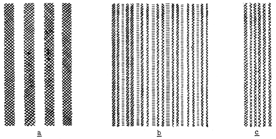 Fig. 8. Diagrams of stripings in Chincha plain-weave cloths: a, two-color stripe, blue and natural color cotton; b, two-color stripe, blue and brown on natural-color ground; c, allover stripe of blue on natural-color ground.