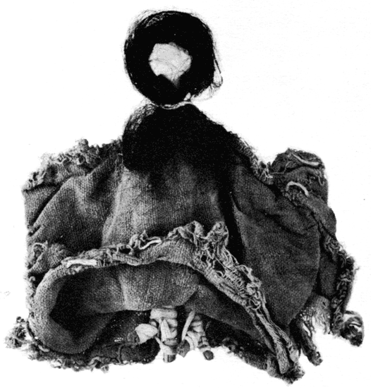 Chincha doll (4-4116) dressed in scrap of plain-weave material. Height overall, 7 inches. Head, a knob wrapped with fiber; black human hair folded over top and drawn in at neck with fiber string. Body composed of 2 tortoras separated to form legs; all elements wrapped with fiber and with one extra "toe" applied to each foot. Arms of wrapped tortora with fingers (3) applied at ends.