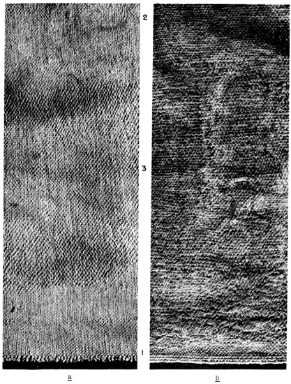 The join is a technical feature that indicates standards of craftsmanship. It is customary in weaving materials with end as well as side selvages to give more or less attention to the closing of the space between the weaving proper and the heading strip. When the warps in the form of a skein had been spread out evenly and bound in place to the end bars, the ancient weavers on two-bar looms first wove a shallow heading strip to secure the warps in their positions and to establish the ultimate width of the fabric, a practice followed by some modern weavers today. Then the weaver reversed the loom end for end to begin what became the weaving proper, and continued until the length was complete. Difficulties or indifference to appearance very often resulted in a general looseness of texture where standard-size tools had to be removed and the interlacing done more or less by the fingers. Plate 2,a, b shows heading strips of different depths, fairly wide join areas in which the wefts are more widely spaced, and above these, the compact texture of the weaving proper.