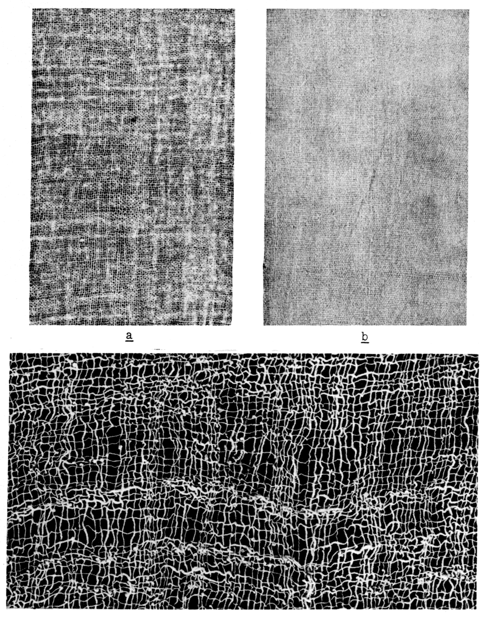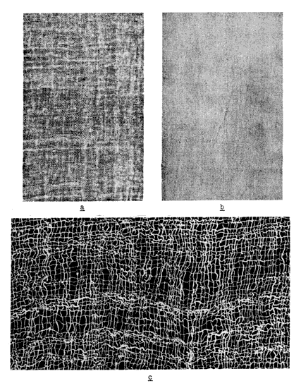 Textures of fine fabrics. a, comparable to modern cheesecloth (4-4058b); b, canvaslike (16-1255a); c, open plain weave showing high twist of single-ply yarns (4-3883b).