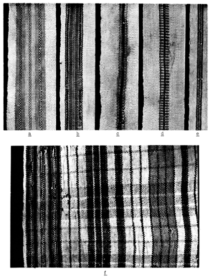 Stripes in this sample group either border the edge of the cloth or make an allover pattern. With the exception of four cloths, the stripes are warpwise of the materials; these four have stripes both warpwise and weftwise, and thus may be classified as plaids. Edge stripes occur in combination with an allover strip pattern in specimen 16-1287 and in combination with plaid in specimen 4-3973d (pl. 6,f). There are no cloths crossbanded only with colored wefts.