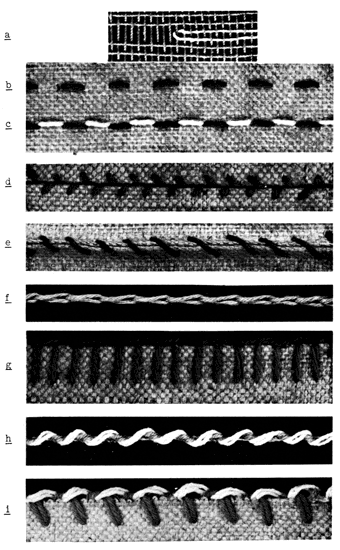 Reconstructions, a, fill-in weft to straighten working edge (cf. pl. 5,e); b, plain running stitch; c, double running stitch shown in two colors for clarity; d, seam in saddler's or baseball stitch, also called antique seam; e, seam in whipping stitch: f, g, top and side view of needleknitting type found on Chincha edge (pl. 5,c), alternate stitches plain whipping stitches; h, i, two views of reinforced selvage showing strand of twining through tops of whipping stitches.
