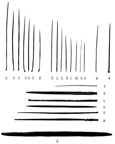 Weaving and sewing equipment: a-g, undressed thorns, 3.5 to 6 inches long (4-3653); h-o, bunch of fine wooden needles (n shows eye) 4.5 inches long, black and pale color wood (4-3651); p, copper needle (4-4094); q, headed and pointed stick, possibly a warp-lifter (4-3865f); r-w, sticks, some of cane including pointed and headed tools (4-3865a-e, g, h): s, u, weaving swords; t, loom bar; x, weaving sword, 18 inches long.