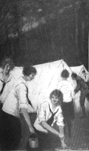 Hence the second summer of the Dandelion Troop of Girl Scouts was spent on the shores of First Lake, one of the Fulton Chain of lakes. There was a boys’ camp a mile away, and Mr. Gilroy divided his time and interest between the two camps. The girls won such favor, however, that their host invited them to accompany him the following summer on a camping trip through the Rocky Mountains.