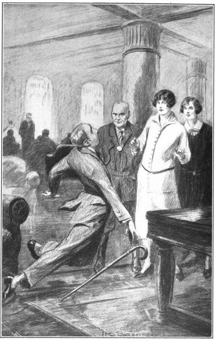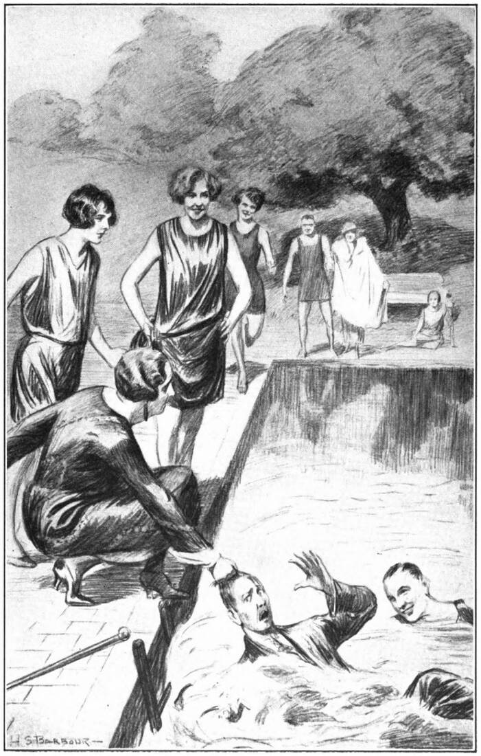 Since he detested water in quantity sufficient for swimming, Algy was unprepared for his impromptu bath. It was quite deep beneath the platform, to accommodate those who wished to dive, and now the frightened youth came to the surface spluttering and throwing hands above his head in a wild attempt to clutch at some support.