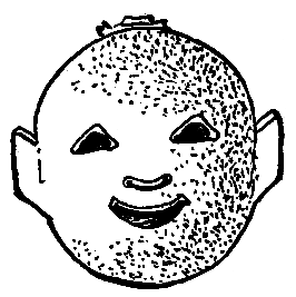 Select a small, firm, perfect orange and with a pencil mark features on it, first the eyes like Fig. 199. Carefully cut out the little spaces of skin between the lines, then mark the nose (Fig. 200); cut this and mark the mouth (Fig. 201); cut this and at each side of the head draw the ears like Fig. 202. You will see that the line of the ear does not continue all the way around; that means that you are simply to run your knife along the line, cutting through the skin so that the ears may be lifted up and peeled forward to stand out from the head; the front part remains attached (Fig. 203).