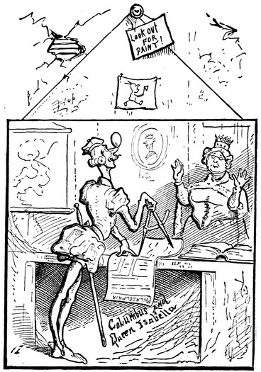 “Oh, come now, Christopher! really, this 25is going to far!” is what public opinion said, and when our hero petitioned the Italian Congress to fit out an expedition and let him prove his theory, it magnanimously offered to set him up in business with a first-class barrel-organ and an educated monkey cashier on condition of his leaving the country once for all; but Columbus, expressing his regret for his lack of musical ability, declined this generous offer and turned with a sigh to other governments for assistance. Finally, after fifteen years of effort, he succeeded in convincing Queen Isabella of Spain that there was an undiscovered country beyond the seas, overflowing with milk and honey, which it would be worth while to “work up.” He proved his theory with the aid of an egg, (which he made stand on end,) 26an old Boston City Directory, and a ground plan of Philadelphia, (see school books,) and demonstrated to the good lady’s entire satisfaction that she might realize largely by fitting out an expedition and let him at its head go and discover it.