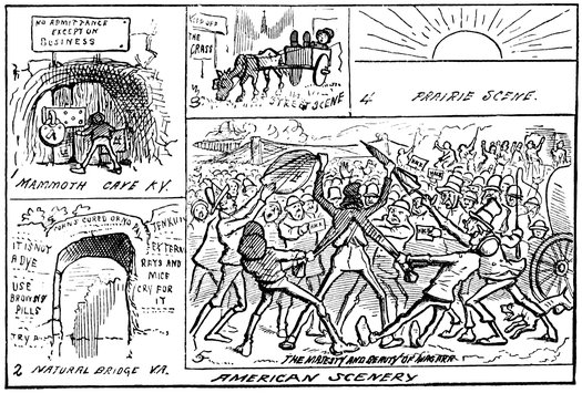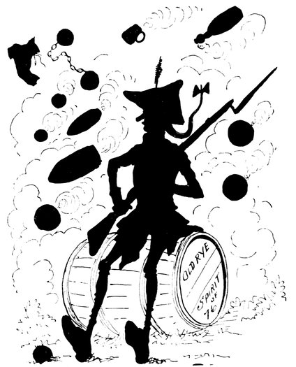 If the patient reader will be good enough to examine this picture with a powerful microscope, he will discover, standing upon the utmost prominence of the new world, and in imminent danger of falling off, a citizen of the country who welcomes the 17stranger with uplifted tomahawk and a wild war-whoop.