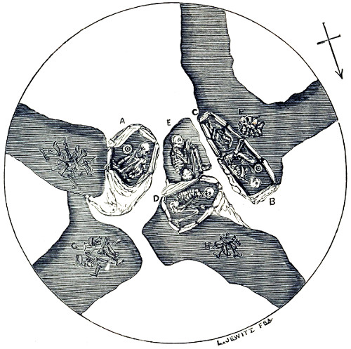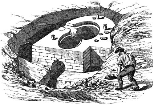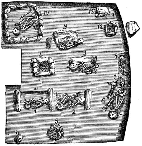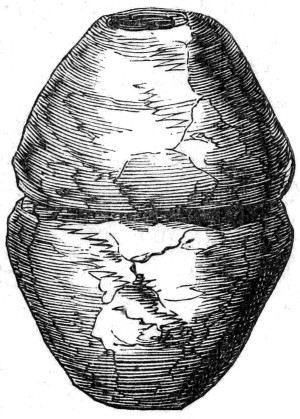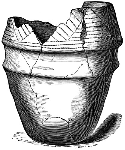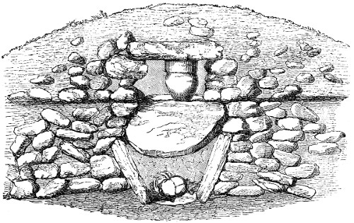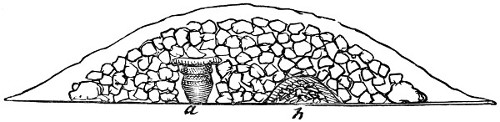 12 Although I am describing the position in which the urns have been placed, it must not for a moment be supposed that they are often found in a perfect state, or in the position in which they have originally been placed. On the contrary, the urns are usually very much crushed, and not unfrequently, from pressure of the superincumbent mass of stones and earth, are found on their sides, and crushed flat.