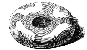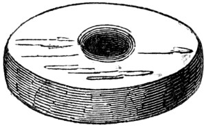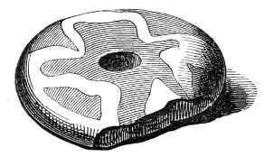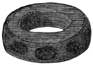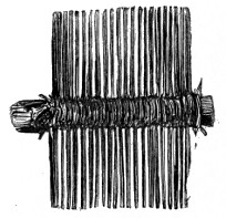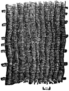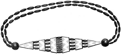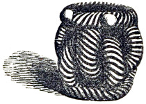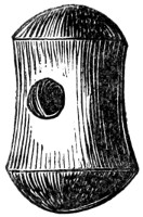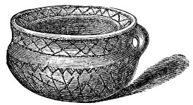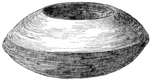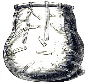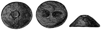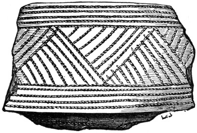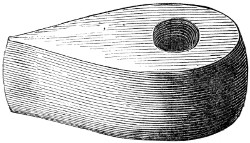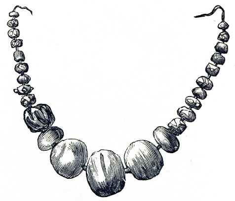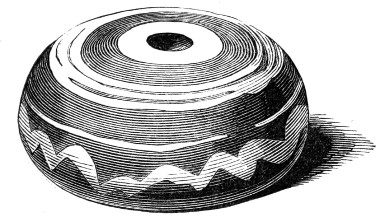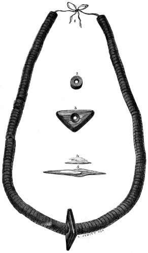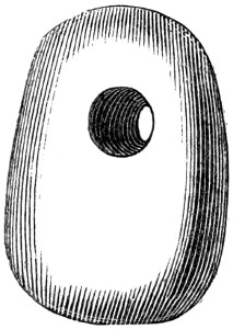 16 This woollen cloth must be regarded as a woven texture, but whether it were woven in so artificial a machine as a loom may be questioned. A great variety of contrivances have been used for weaving, i.e., crossing alternately threads passed in opposite directions, the warp and the woof, by what are called savage races. Still it is not at all improbable that a people so advanced in pastoral habits, possessed some machine for weaving, bearing a relation to a primitive loom. Both warp and woof are composed, as might be expected, of a simply spun thread of one strand. Perforated stones are found in British and Danish barrows, and perforated pieces of earthenware in the Swiss Lake villages, even of the stone period, which are regarded as spindle-whorls.