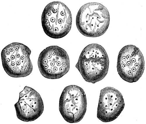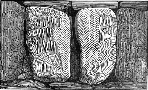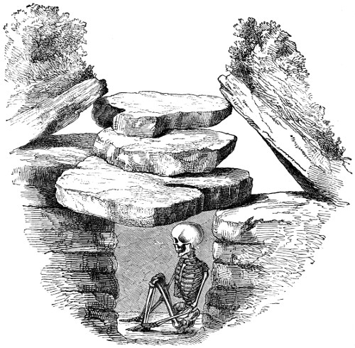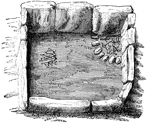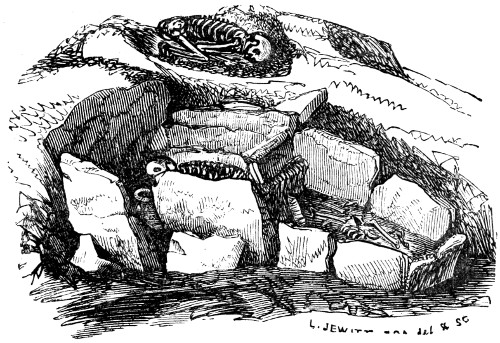 4 It will be well to bear in mind that when “rats’ bones” are mentioned, it must be understood that they are the bones, not of the common rat, but of the water-vole or water-rat. They are very abundant in Derbyshire barrows, and, indeed, are so frequently found in them, that their presence in a mound is considered to be a certain indication of the presence of human remains. “The barrows of Derbyshire, a hilly, almost mountainous, county, abounding with beautiful brooks and rills, inhabited by the water-vole, were made use of for its hybernacula, or winter retreats, into which it stored its provisions, and where it passed its time during the cold and frosty season. It is a rodent, or gnawer, or vegetable eater, and, as I have described elsewhere, has a set of grinding-teeth of the utmost beauty, and fitted most admirably for the food on which it lives. The part of the matter which is curious to the antiquary is, that the bones in Derbyshire barrows are frequently perceived to have been gnawed by the scalpri-form incisors of these animals. I have endeavoured to explain, in the note referred to, that all the rodents amuse themselves, or possibly preserve their teeth in a naturally useful state, and themselves in health, by gnawing any object that comes in their way. This is well known to every boy who keeps rabbits. I remember, some years ago, seeing a very fine black squirrel in the house of a workman in this town, which had been sent him by his son from Canada. It was found that it was impossible to keep this animal in any wooden house. He would gnaw a road out of the strongest wooden cage that could be made for him, in a few hours. In consequence, his owner made him a tin cage, in which he was kept securely. In confirmation of what I have said respecting the water-voles, vegetable feeders, gnawing the bones of the ancient Britons in barrows, I may refer to Linnæus’s most interesting Tour in Lapland. When in Lycksele, Lapland, June 1, he describes the Kodda, or hut of the Laplander, and incidentally remarks, “Everywhere around the huts I observed horns of the reindeer lying neglected, and it is remarkable that they were gnawed, and sometimes half devoured, by squirrels.”—I. 127. That is, if anything were truly devoured, it was the antlers, not the bodies. “The bones of the Arvicola, or water-vole, were found in the exploration of the colossal tumulus of Fontenay de Marmion, which was one of the galleried tumuli, opened in 1829, near Caen in Normandy. It belonged to the primeval period of the ancient Gauls.—Mem. de la Soc. des Antiq. de Normandie, 1831-3, p. 282.”—Dr. Davis.