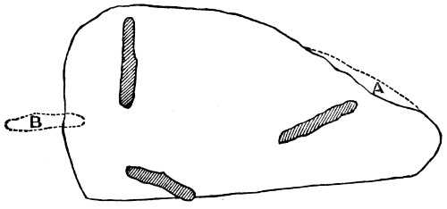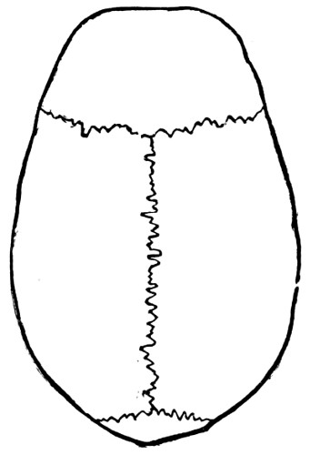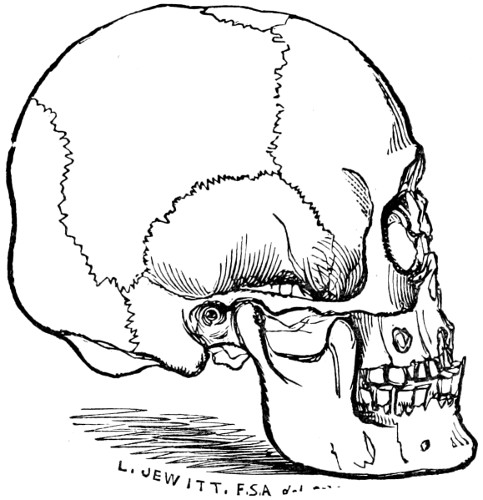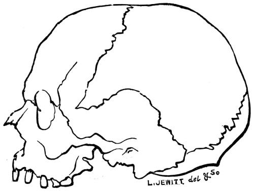13 This skull has been most skilfully figured in “Crania Britannica,” where it is carefully described and compared with other examples by Dr. Davis, who gives an admirable account of the discoveries at Long-Low, and of the characteristics of the different crania found there. Of the skull here shown Dr. Davis says it is “remarkably regular, narrow, and long; of good shape, medium thickness, and presenting few of the harsh peculiarities of the ancient British race; on the contrary, there is about it an air of slenderness and refinement. In some features it assimilates to the modern English cranium, although decidedly narrow, whilst its genuine and remote antiquity is determined by unquestioned evidence. It belongs, in an eminent degree, to the class of dolichocephalic skulls, and is the cranium of a man of about forty years of age.”