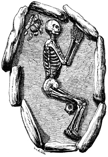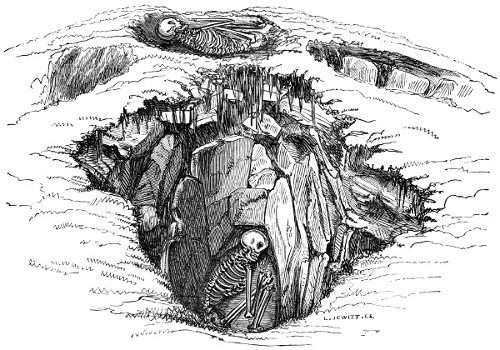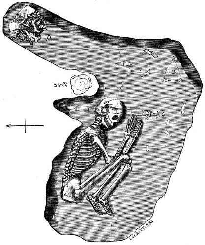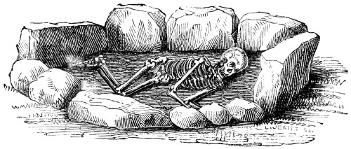“Interred in the soil above this portion of the barrow, and lying amongst loose stones, the remains of four other skeletons occurred, placed in the primitive flexed position. One of these had apparently been disturbed at no long period subsequent to interment, and the bones laid in order before they had become decayed—a practice adopted by some uncivilized people in more modern times.