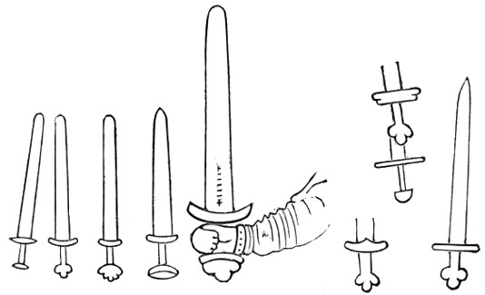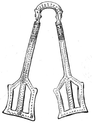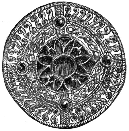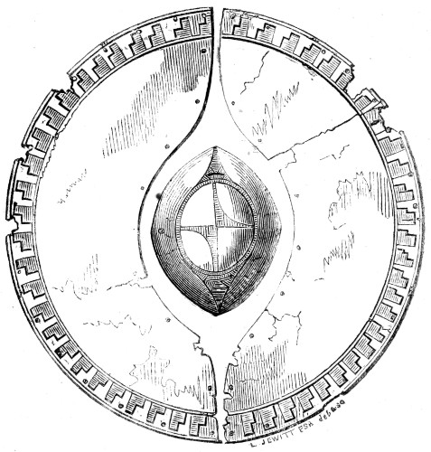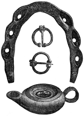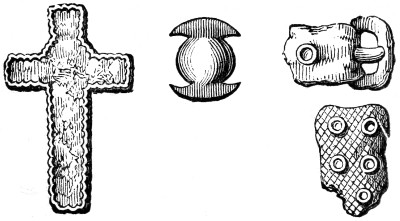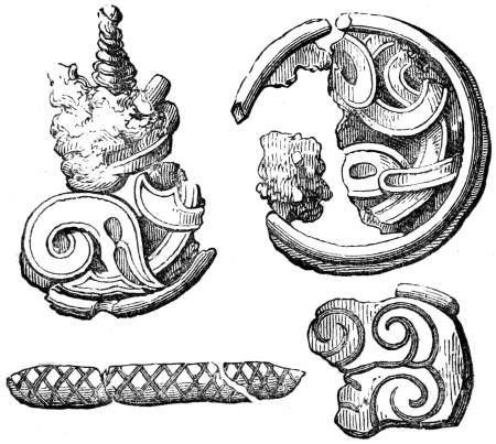 | Anglo-Saxon Period—Arms—Swords—Knives—Spears—Shields—Umbones of Shields—Buckles—Helmets—Benty-Grange Tumulus—The Sacred Boar—Grave at Barlaston—Enamelled Discs and pendant Ornaments, etc.—Horse-shoes | 236 |
