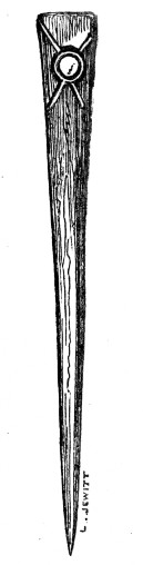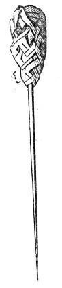 so common in the Derbyshire barrows; a bone pin, 4 inches in length,