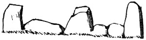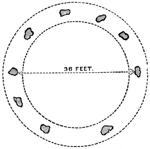 18 These immense monoliths have originally, it is estimated, been upwards of thirty in number, and to have been placed probably ten yards apart. The largest remaining stone stands between eight and nine feet above the ground, and is seventeen feet in circumference. It is estimated to weigh upwards of seven tons. Several of the stones have entirely disappeared, of others fragments remain scattered about.
