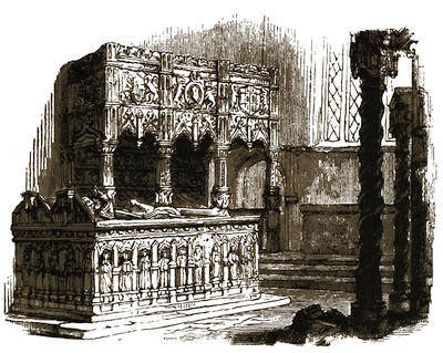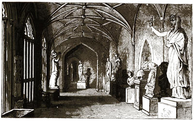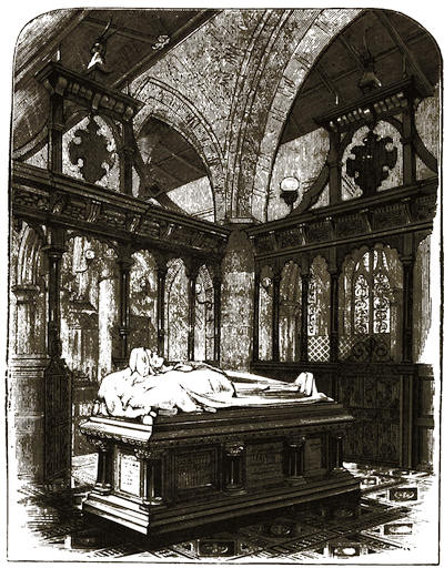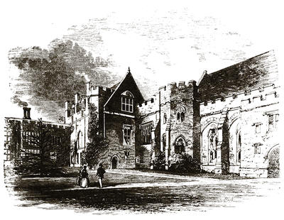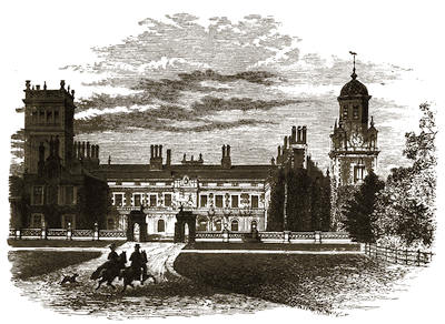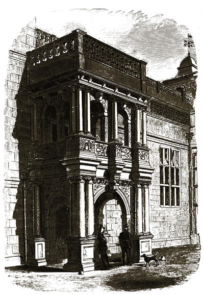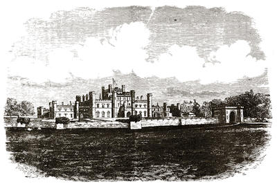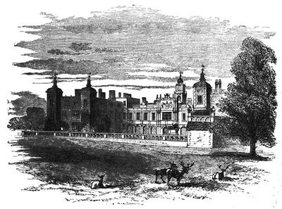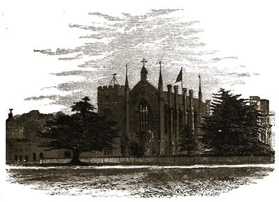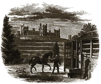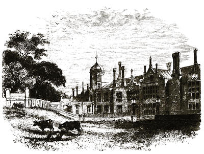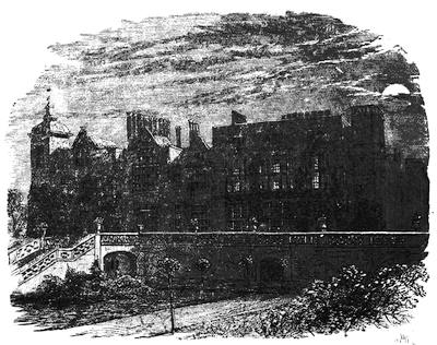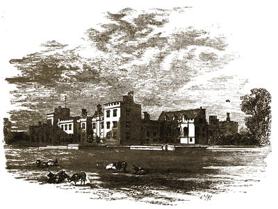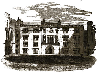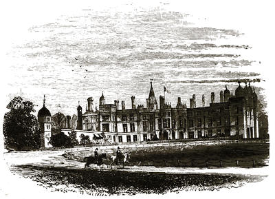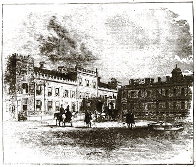[38] The old palace is now the stables; its roof of arches, supported by corbels, is intact, and singularly beautiful. Immediately underneath one of the windows is a stone with the inscription, “The last charger of Arthur, Duke of Wellington (descended from his Waterloo charger, Copenhagen), was presented by the second duke to Mary, Marchioness of Salisbury, June 18, 1852, and was buried near this spot Feb. 24, 1861.”