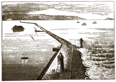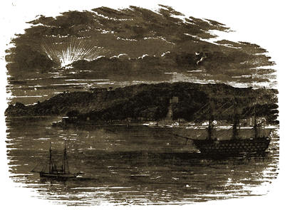 From the lantern tower of the hotel, rising far above the buildings near, and also from some of the windows in the upper floor, is to be obtained a magnificent view of the Sound, with the near Breakwater, and the Eddystone Lighthouse, “far out at sea;” while the grassy slopes of lovely Mount Edgcumbe and its tree-capped heights are seen to rise in front, overhanging the land-locked harbour, called Hamoaze.