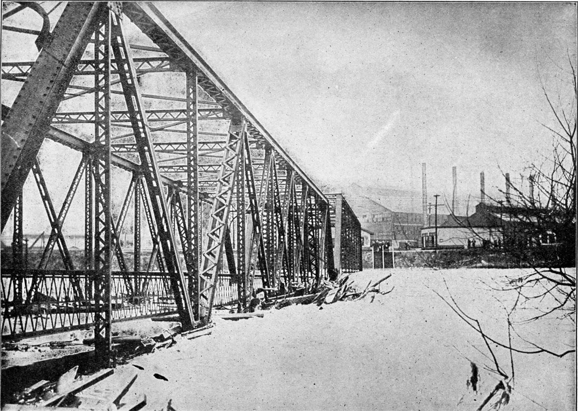 Over in East St. Louis, where the houses were all frail structures, the destruction was greatest. The great Eads Bridge was twisted all out of shape, and freight cars were tossed to and fro, tumbled into ditches and driven sometimes into the fields many yards from where they had stood. The great Vandalia freight house fell in a heap of utter ruin, burying beneath it thirty-five men who had there sought refuge.