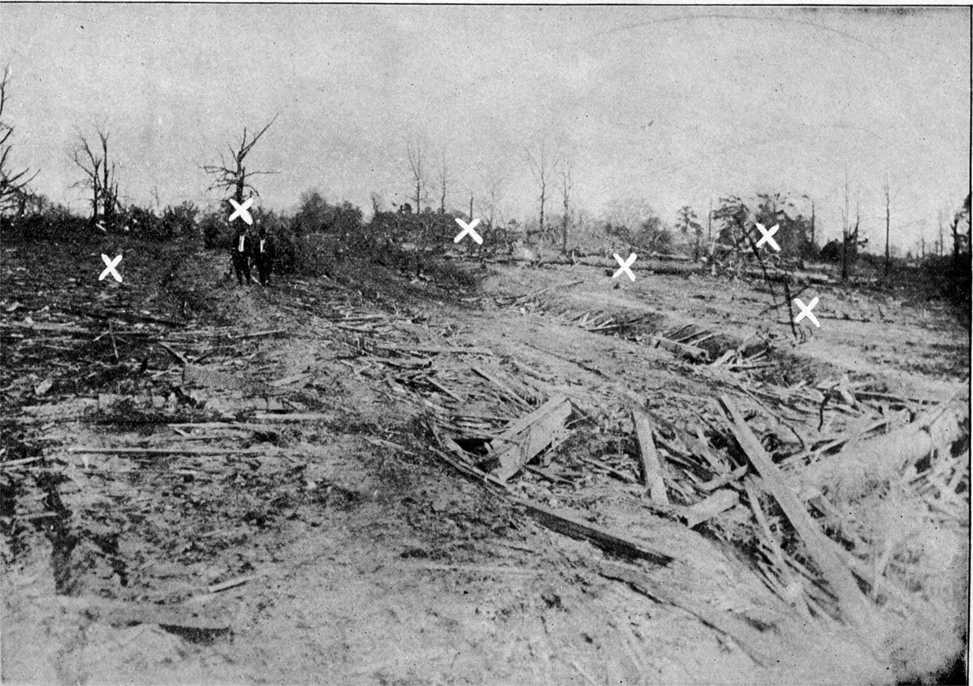 The swath cut was three blocks wide and four miles long. The top of the bridge was knocked off as well as the big abutment. The Martell House was blown into the Cokokia Creek and many were buried in the ruins.